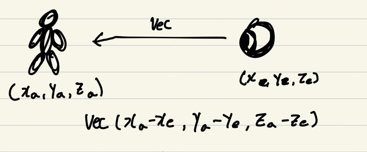 플레이어를 바라보는 벡터가 필요한데, 이것은 (플레이어 위치 - 눈알의 위치) 를 통해 구할 수 있습니다.