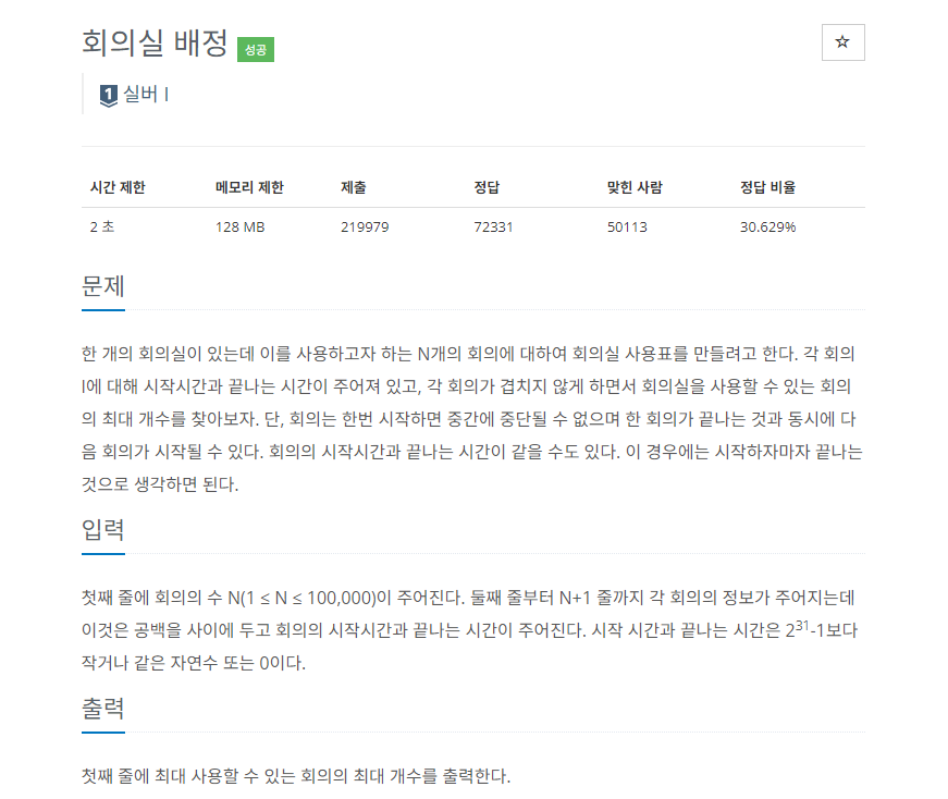 StudyAlgorithm_Part2/백준/Silver/1931. 회의실 배정 at main · J2on/StudyAlgorithm_Part2