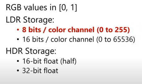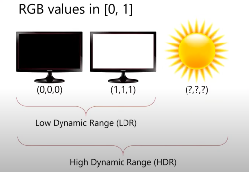 하지만 흰색(1,1,1) 보다 밝은 것은 (0,0,0)과 (1,1,1) 사이의 LDR에서 표현할 수 없고, HDR이 필요하다