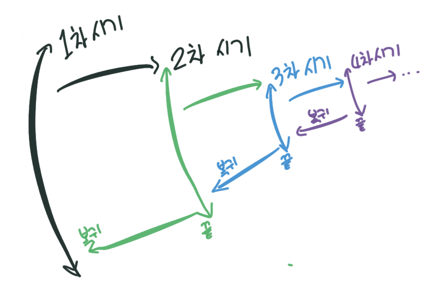 그림에 나타낸 것처럼 1차 2차 회차를 올려가며 목표 회차에 도달했을 때 그 회차의 함수를 종료시키면 그 전 회차 함수들이 순서대로 종료됩니다.
