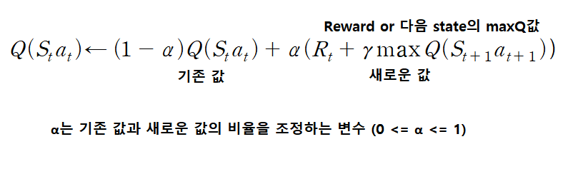 t+1번째 State가 목표지점인 경우 αRt, 아닌 경우 αγmaxQ 가 새로운 값이 된다.