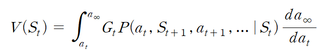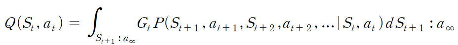 S_(t+1), a_(t+1)부터 무한대까지의 State와 action의 나열이 발생할 확률과 그에 따른 return값을 곱해 적분한다.