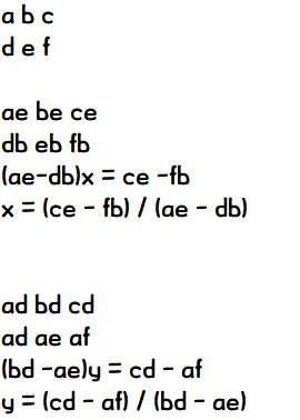 y = (c * d - a * f) / (b * d - a * e);